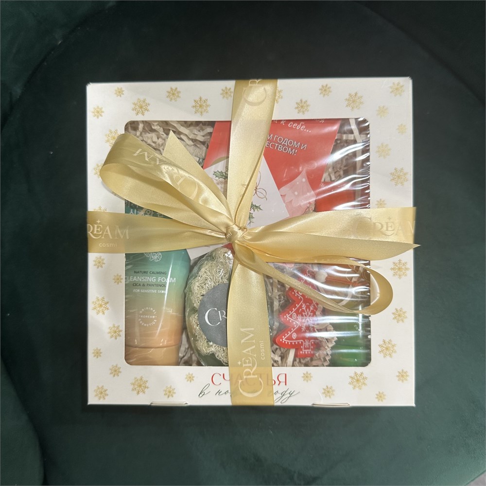 пенка для умывания, крем для рук, брендированное мыло с люфой , игрушка елочка, открытка и сюрприз.