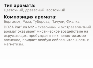 Парфюмерная вода DOZA №2 (аромат JuliettMoonDance) — это чувственный и загадочный парфюм, созданный для современных женщин, ценящих элегантность и глубину. Вдохновленный романтикой лунного света и танцем страстей, этот аромат идеально подходит для вечерних выходов и особых моментов, когда хочется подчеркнуть свою женственность и харизму.