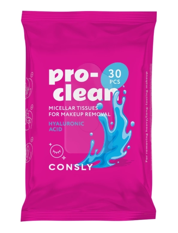 Consly Мицеллярные салфетки для снятия стойкого макияжа с гиалуроновой кислотой Pro-Clean Micellar Tissues for Makeup Removal with Hyaluronic (30 шт)